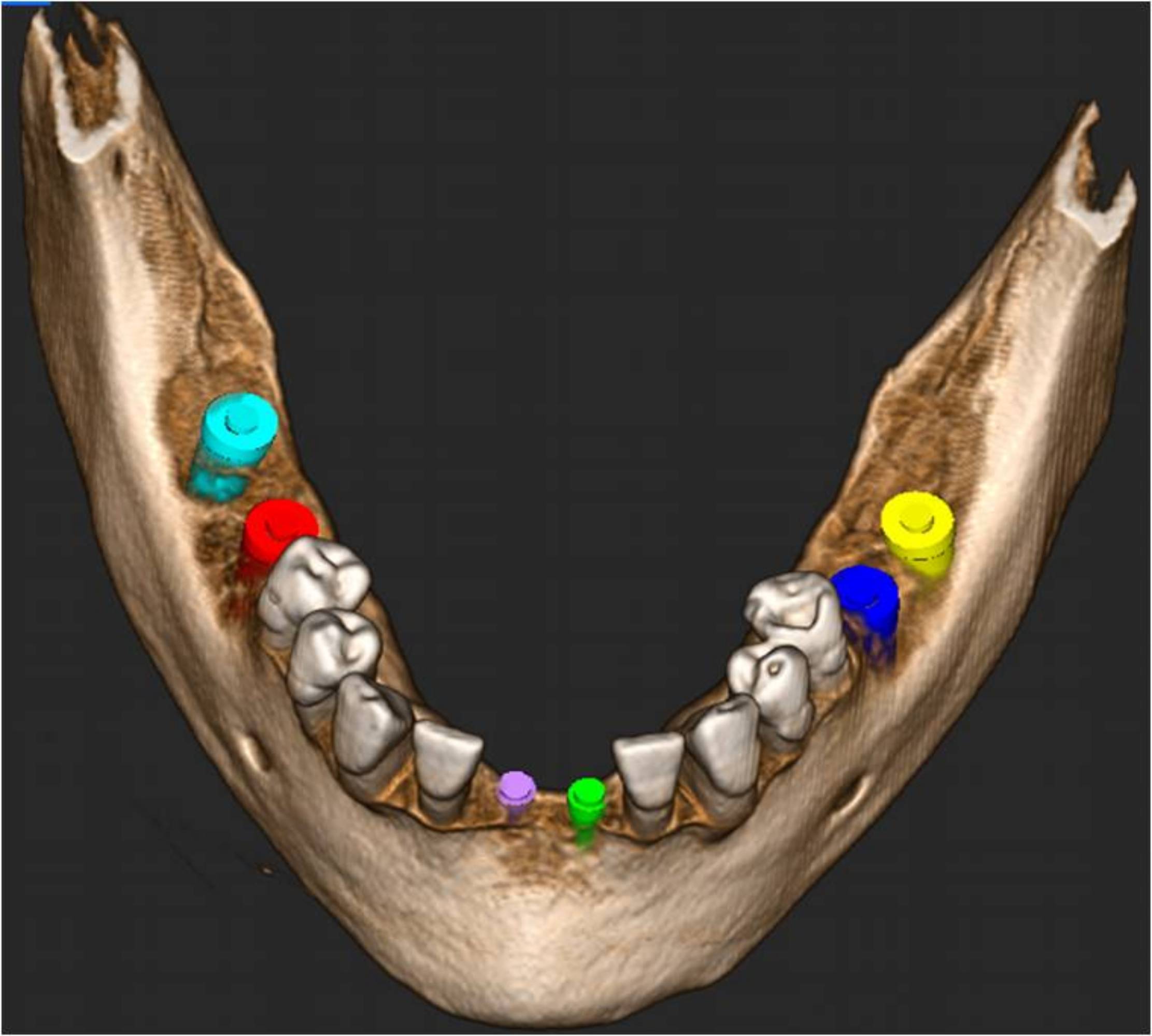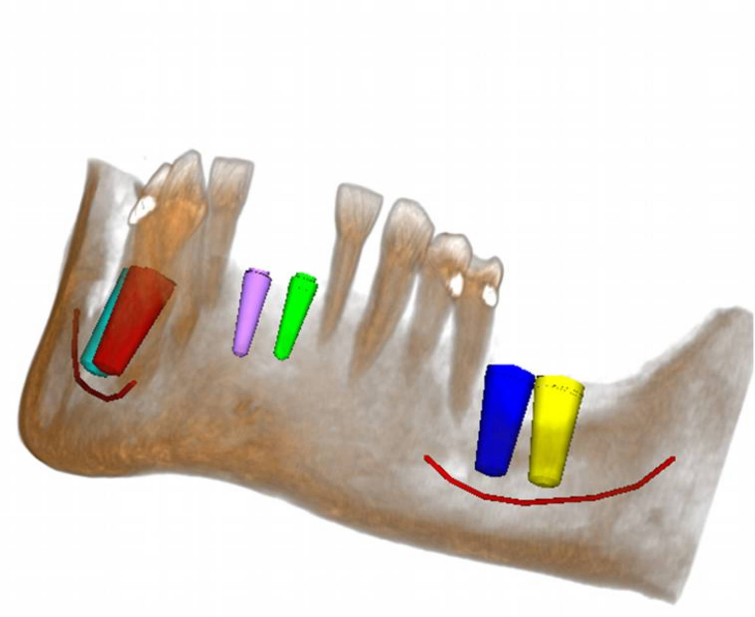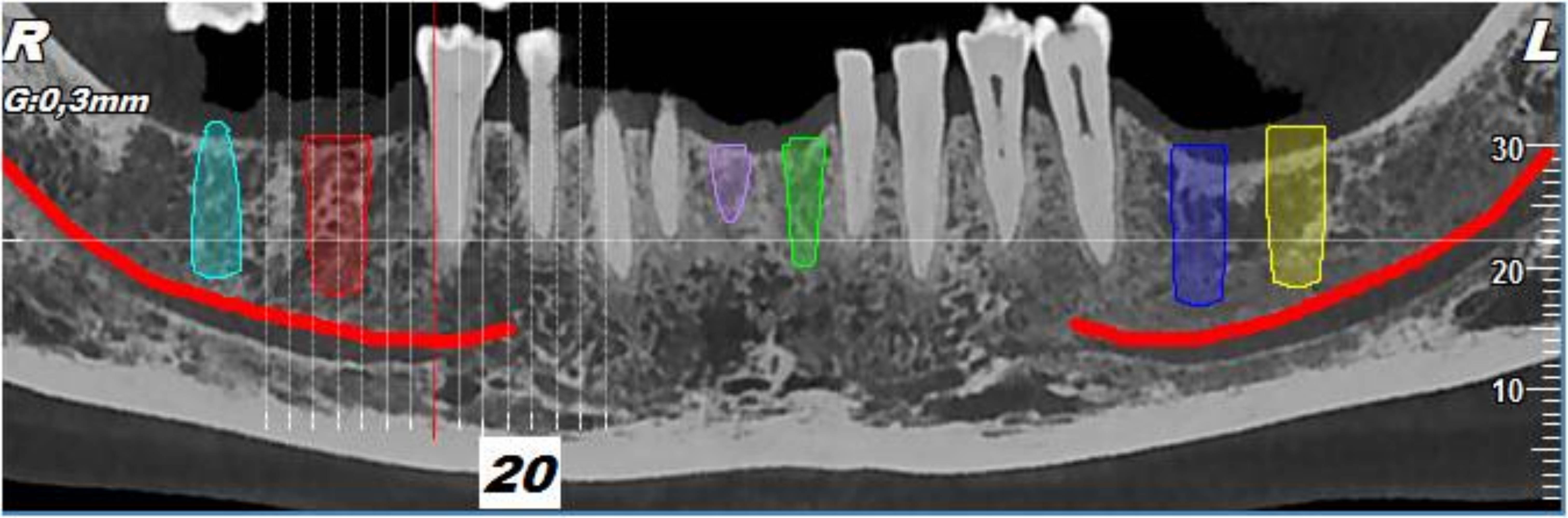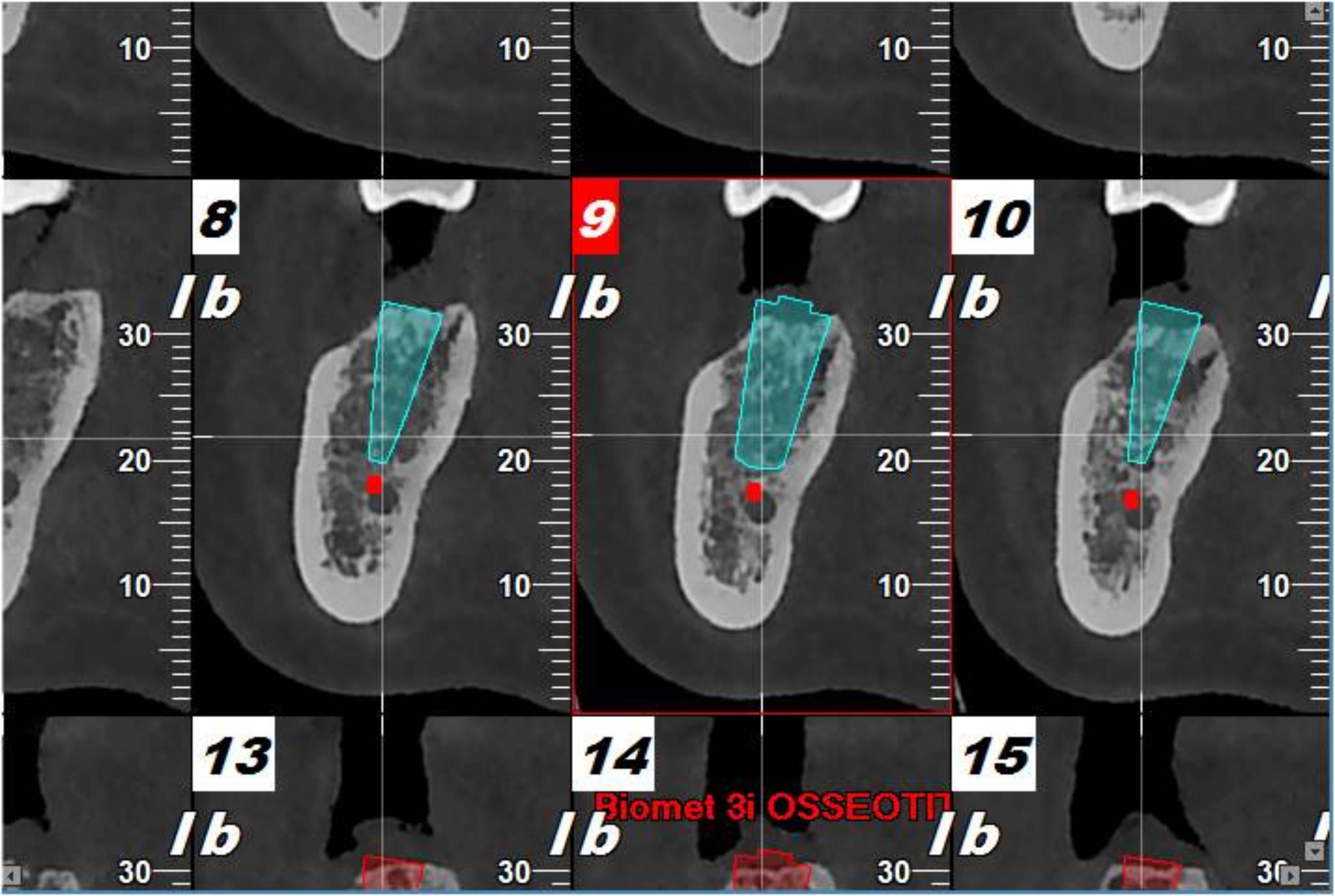 Basándose en los datos relativos a la calidad del hueso circundante y en las medidas a escala 1:1, es posible definir de modo preciso la posición del implante en las secciones 2D y visualizar la simulación en la imagen renderizada en 3D.